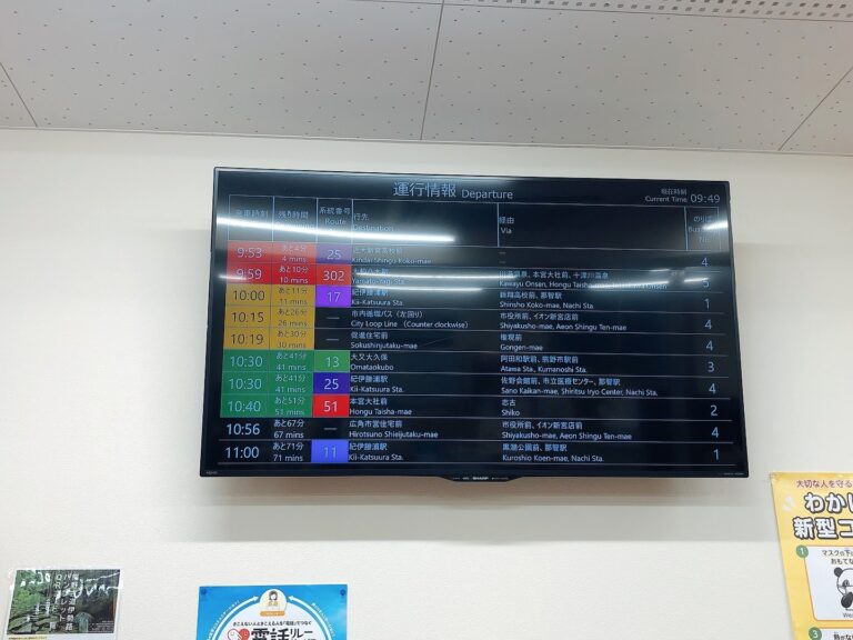 こちらは建物内待合室の様子です。各言語のパンフレットがずらりと並んでいるほか、無料Wi-Fiやトイレ、自販機、喫煙室まで完備。新宮市観光協会の方々がいらっしゃるのも嬉しいポイントです。窓口で旅の相談をすることもできます。