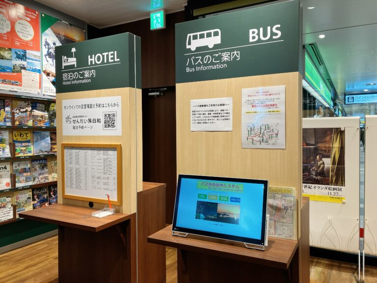 高速バスのりばのすぐ近くには、「仙台駅東口バス案内所」も。待合スペースやきっぷ購入窓口、自動券売機があるほか、女性用更衣室なども用意されていて便利です。