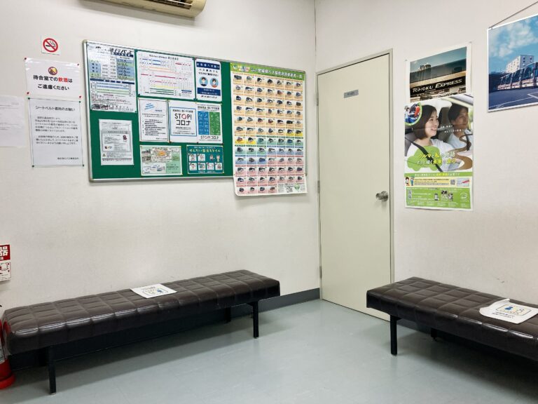 コンビニ横の階段を上がって右手が営業所、奥がお手洗い、左手が待合スペースです。バスの行先が1つに限定されているため、待合スペースの混雑を避けられるのが嬉しいポイント。テレビやエアコンも設置されているため、快適に待つことが出来そうです。