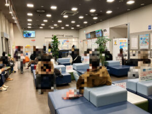 広々とした待合スペース、自販機、お手洗いなど、設備が大充実!どんな天候の日でも安心して待っていられますね。
