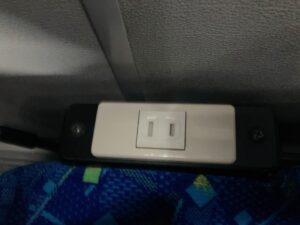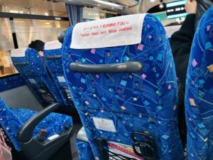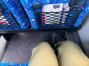 車内は4列シート。電源、無料Wi-Fi、お手洗いが使えます。途中休憩がないので、あらかじめ必要な物を買ってから乗車するのがおすすめです。