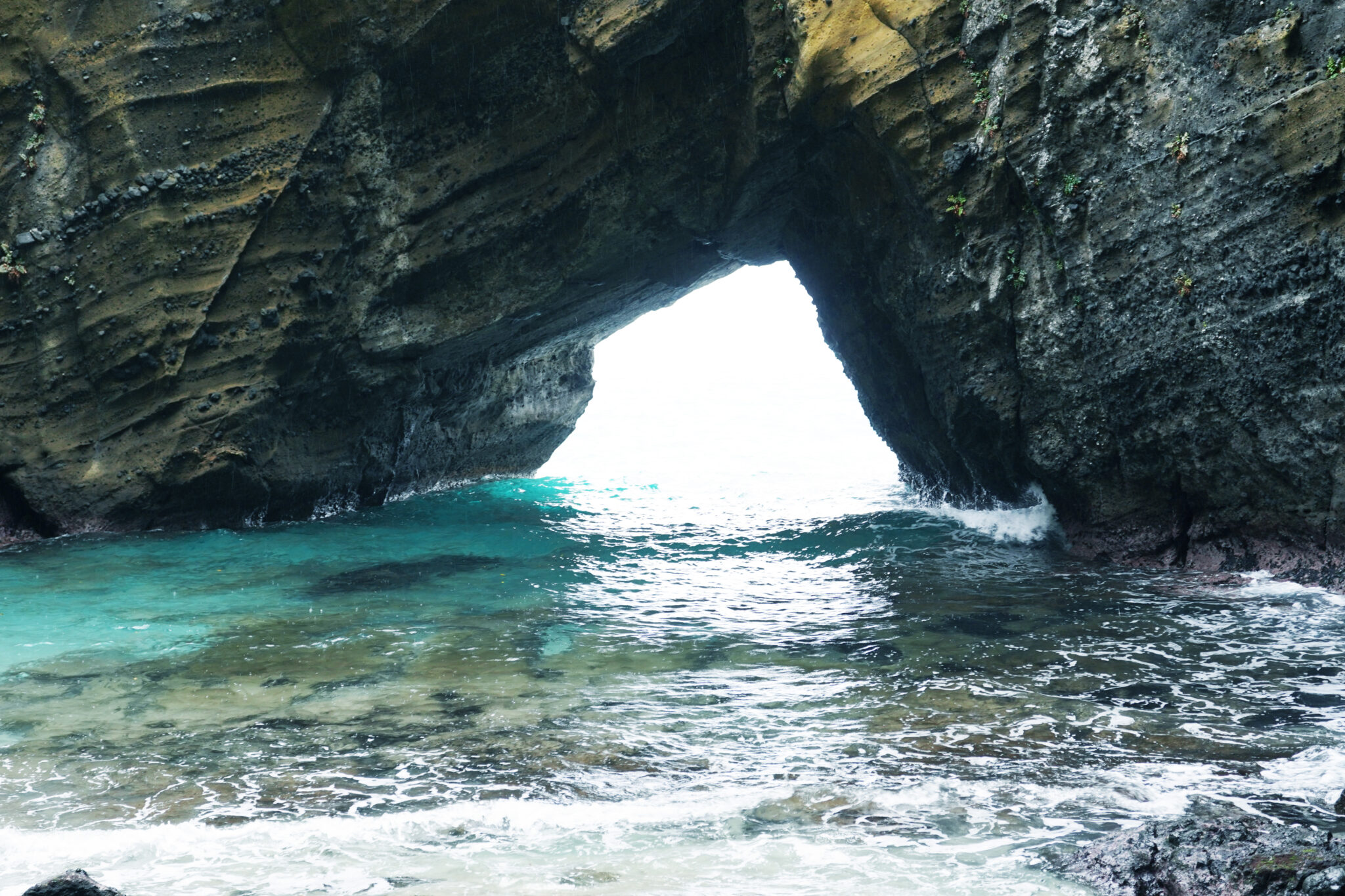 「龍宮窟」は、波の力で地表が削られてできた「海の洞窟」です。天井が一部崩れてしまい、直径50メートルほどの天窓ができ、パワースポット「龍宮窟」が生まれました。