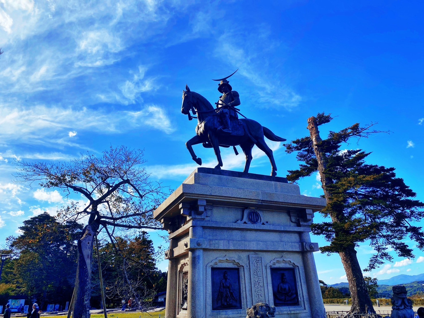 城跡を見守る「伊達政宗騎馬像」です。2022年に起きた震度6の地震で伊達政宗像は破損。2023年3月修復を終え、無事戻ってきました。