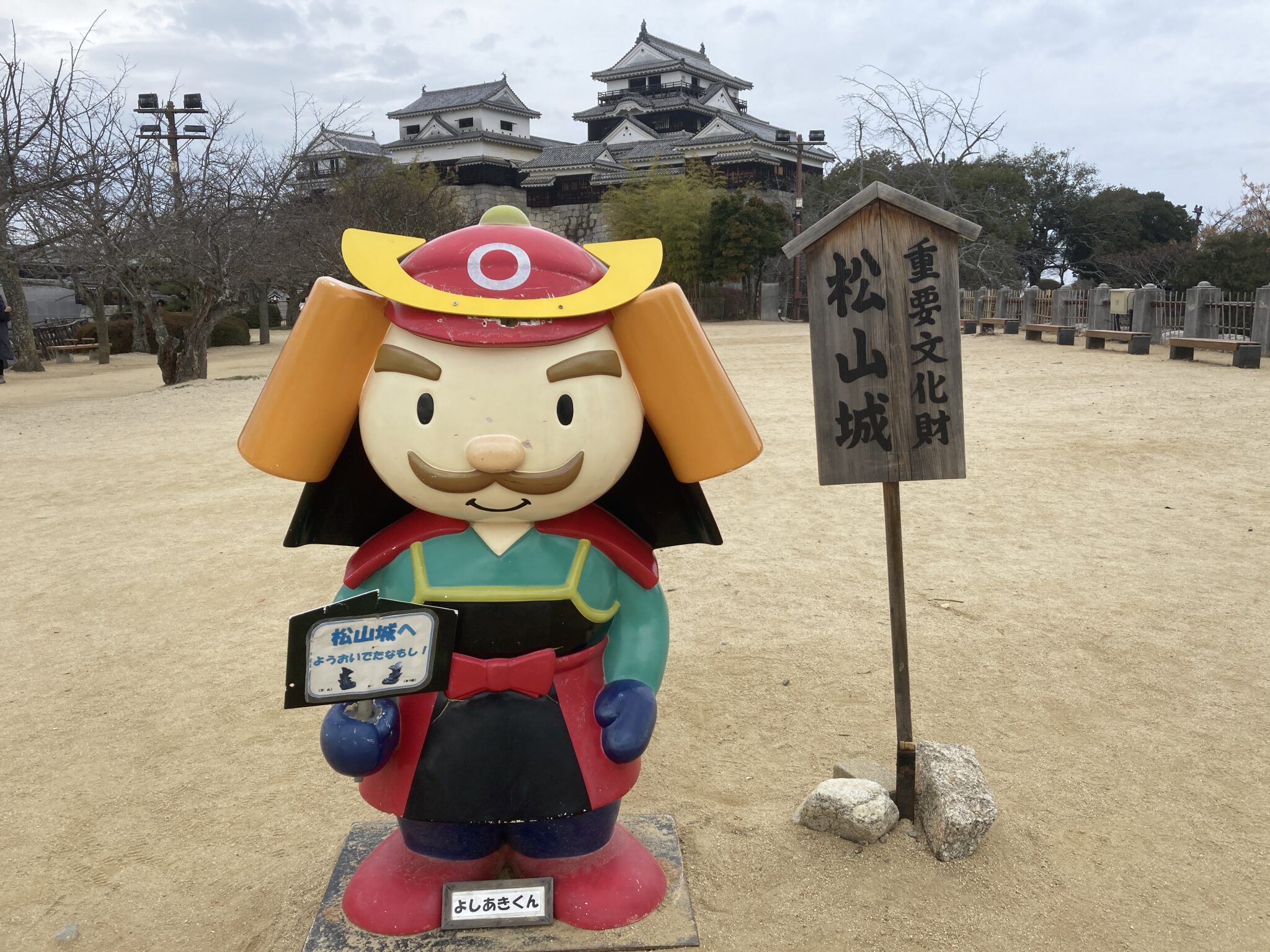 広場の真ん中で愛媛県の松山城のマスコットキャラクター「よしあきくん」のパネルも発見!