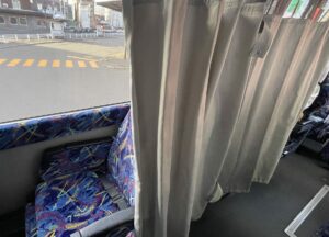 中は3列シート、トイレも完備。カーテンもありプライベートもしっかり保たれていて、安心してすごせます。